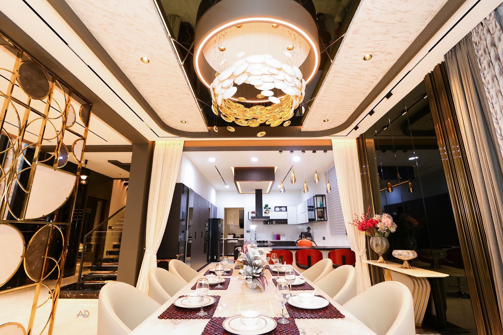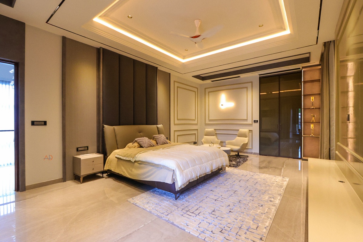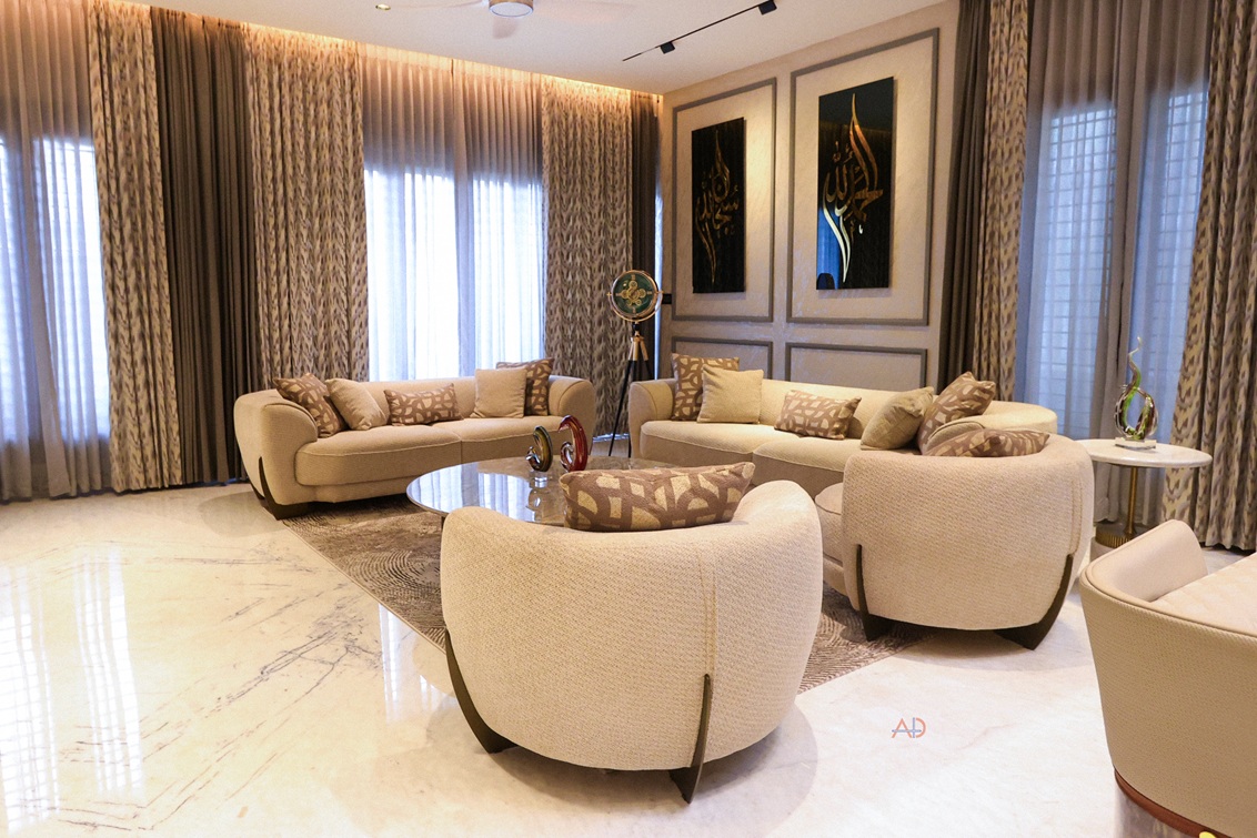 The interiors express a language of restrained luxury through a harmonious palette of soft neutrals, warm metallic accents, natural stone, and rich tactile finishes. Double-height volumes enhance spatial openness and visual connect, while bespoke lighting compositions and carefully layered materials transform everyday spaces into immersive experiences. Each detail is meticulously crafted to balance comfort, refinement, and contemporary elegance—reflecting a lifestyle that is both sophisticated and deeply personal.