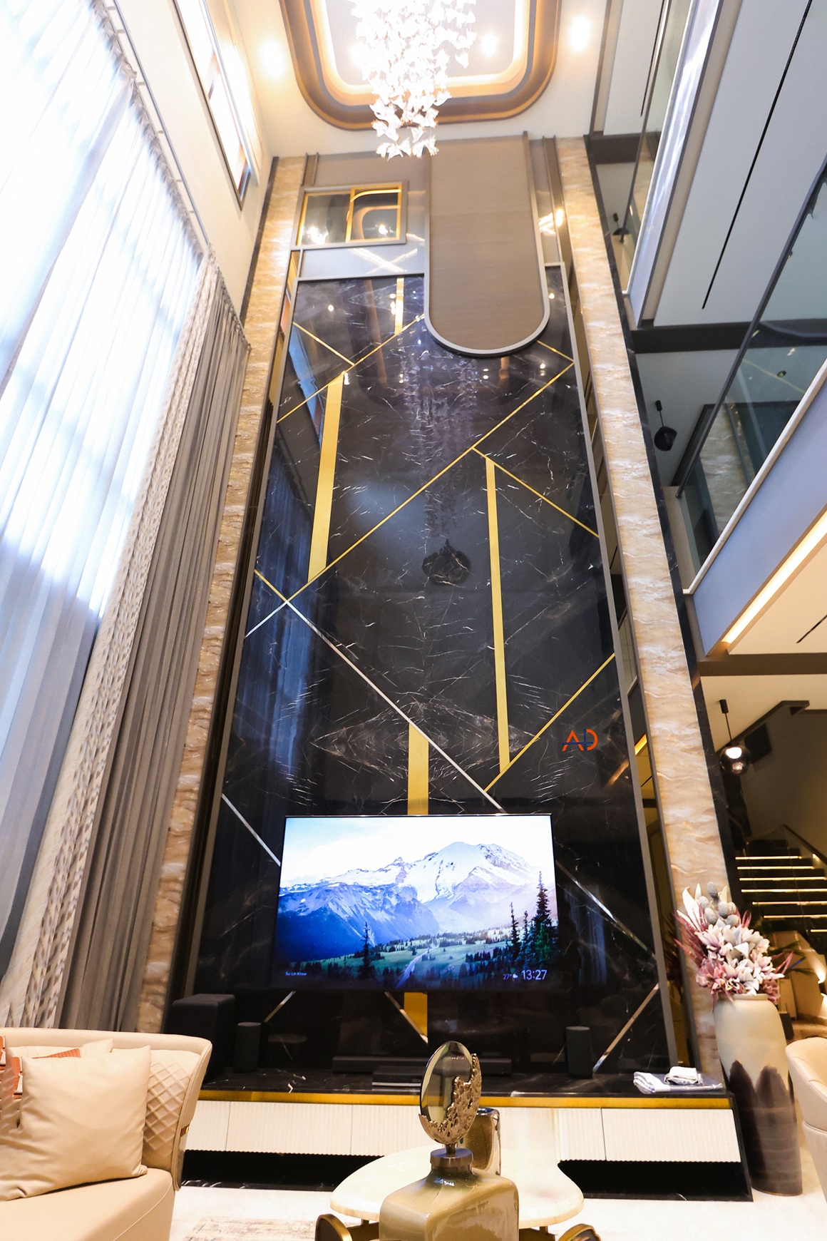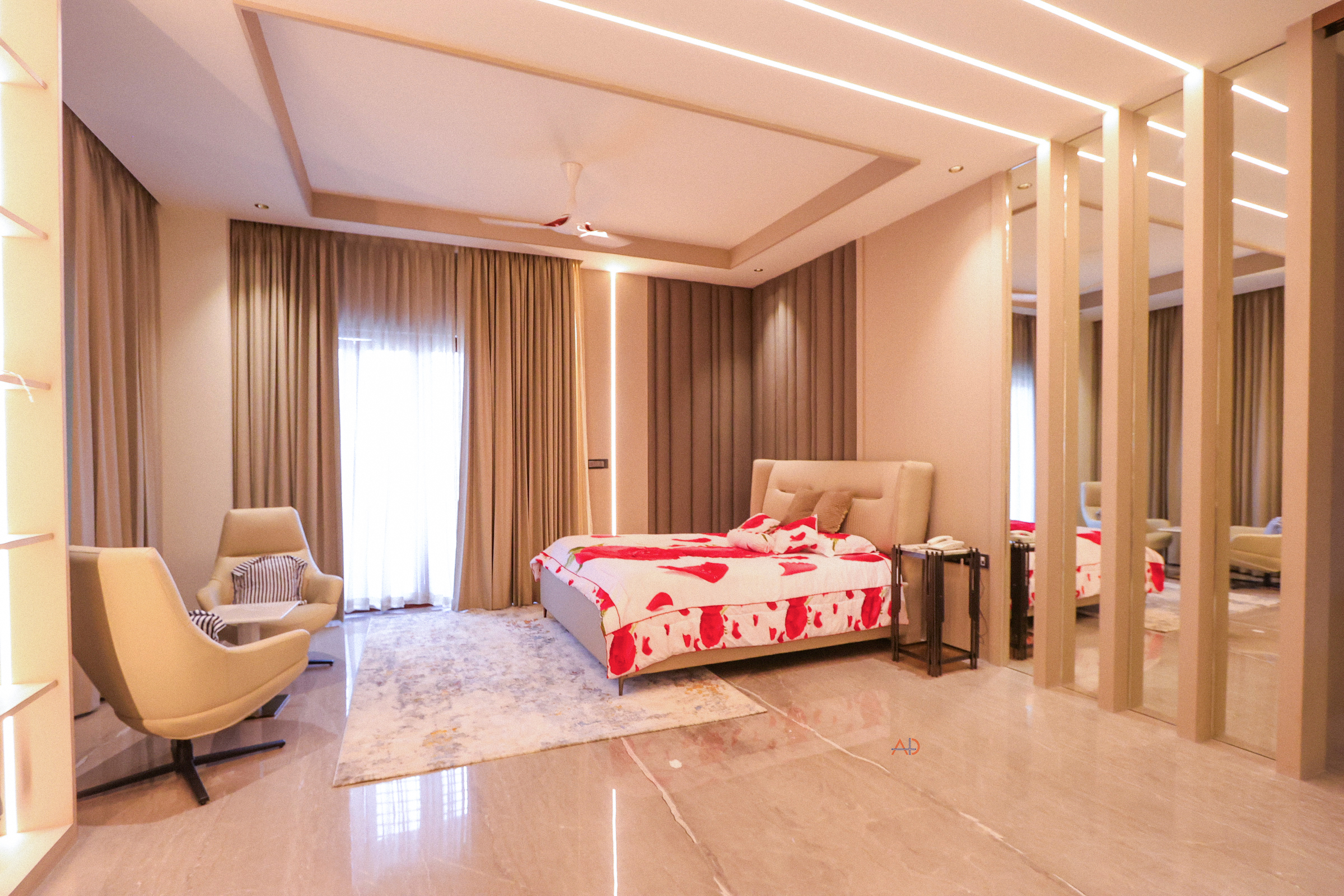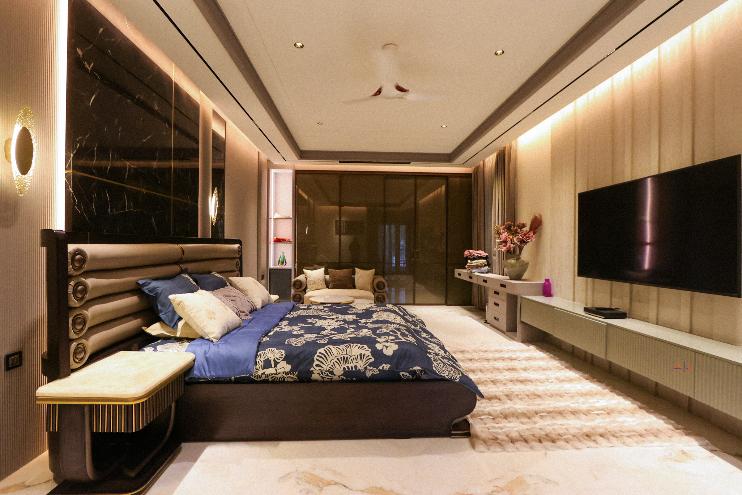 The interiors express a language of restrained luxury through a harmonious palette of soft neutrals, warm metallic accents, natural stone, and rich tactile finishes. Double-height volumes enhance spatial openness and visual connect, while bespoke lighting compositions and carefully layered materials transform everyday spaces into immersive experiences. Each detail is meticulously crafted to balance comfort, refinement, and contemporary elegance—reflecting a lifestyle that is both sophisticated and deeply personal.